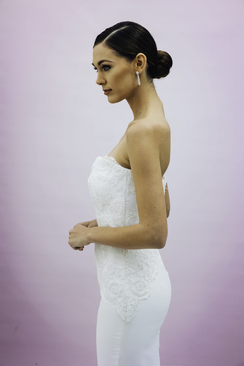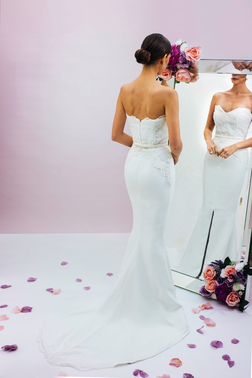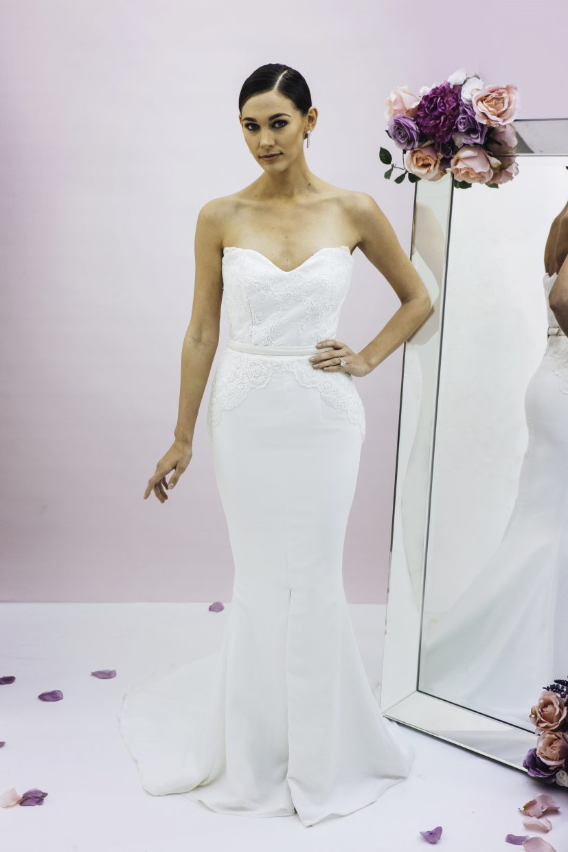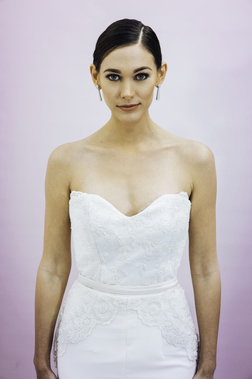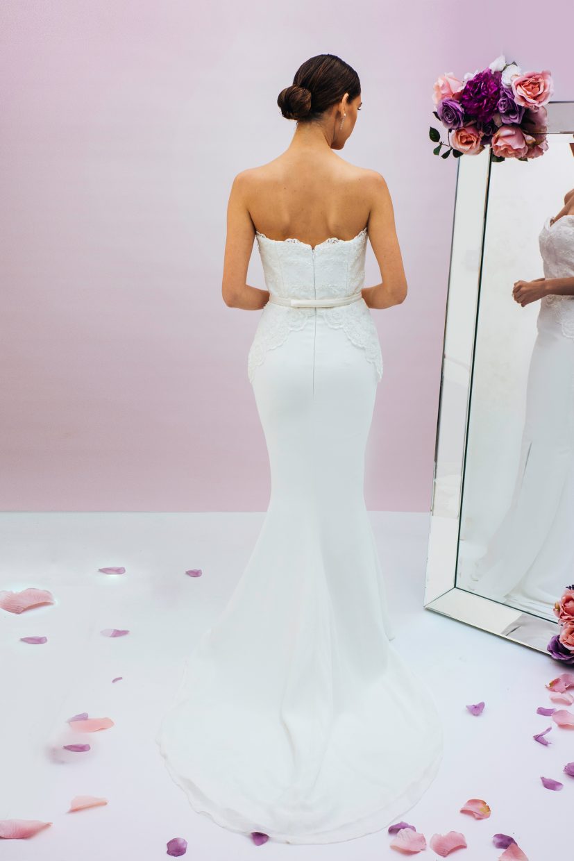 A beautiful sweetheart neckline with a embellished lace bodice into a front and back peplum. The silk chiffon skirt flows beautifully into a small split in the centre front. All of our gowns are made with built in bra cups & are fully boned. Includes a satin detachable waistband for that perfect touch.