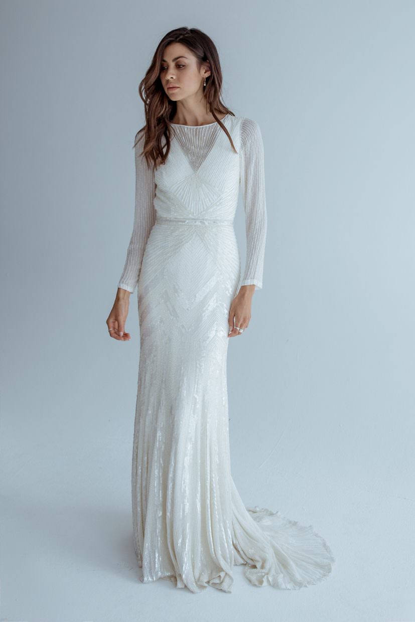 Make a statement in head to toe sequins with the Cassie gown. Featuring long beaded sleeves and a sheer high neck that delicately ties into a bow at the back neck, exposing a low cut out back.