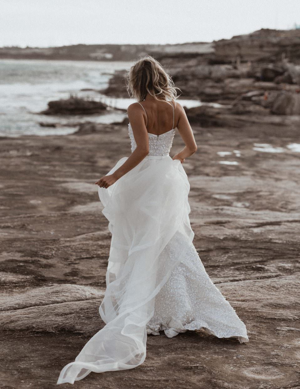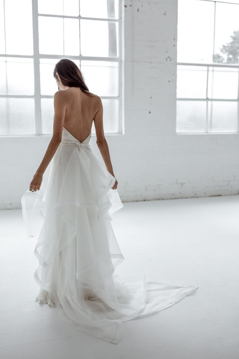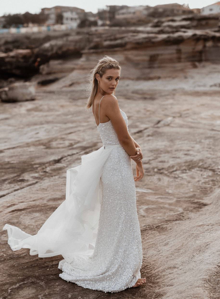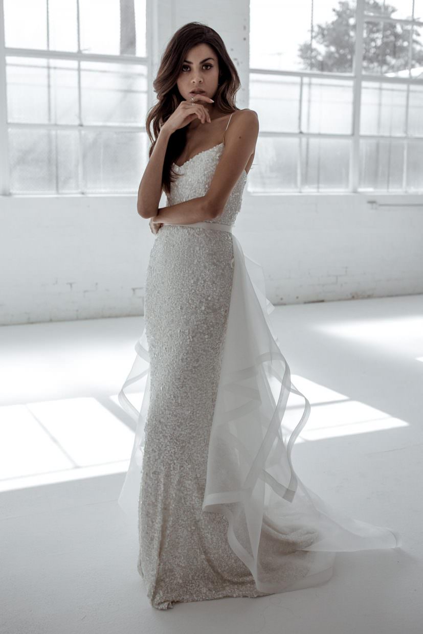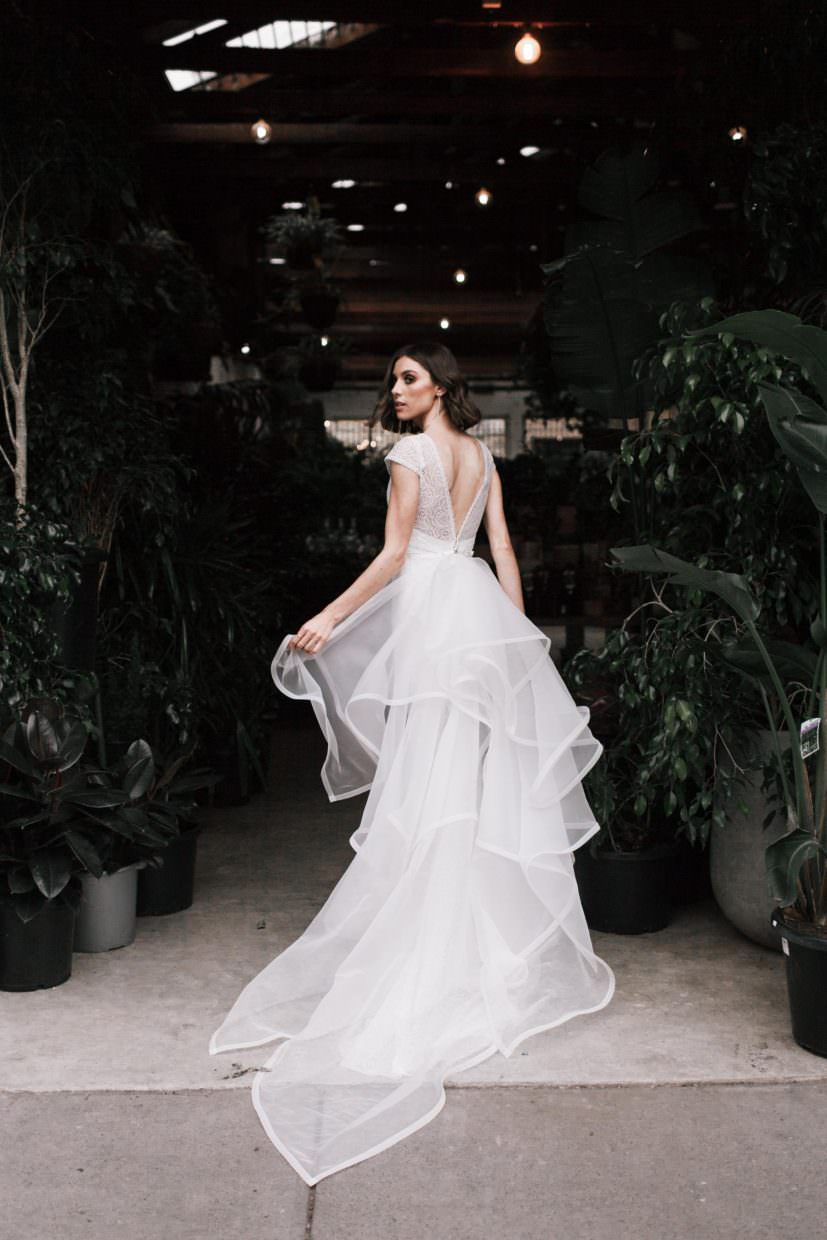 The Diamond Train features varying sizes of diamond shaped organza placed asymmetrically along a waistband and finished with webbing along the hem. A definite wow factor on any gown.