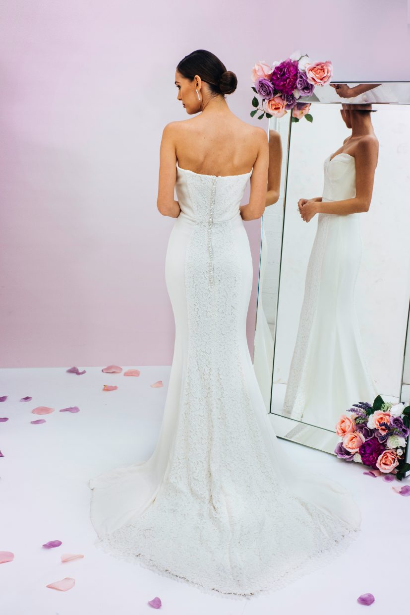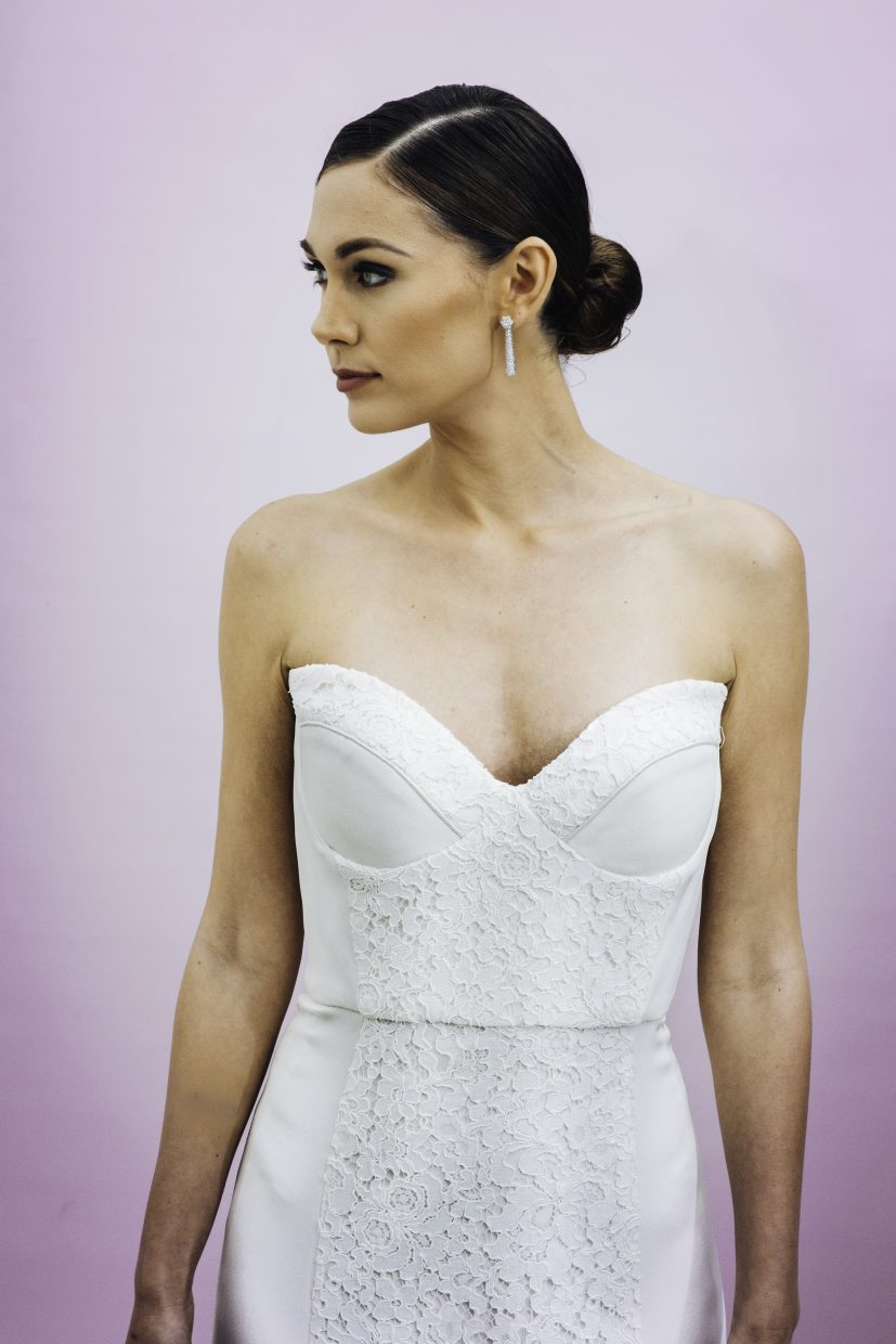 Sweet heart contoured bodice with contrast panelled lace with silk crepe de chine. Lace panels to contour the natural curves of a woman’s body. Row of pearl buttons in the centre back. Lingerie style bustier bodice.