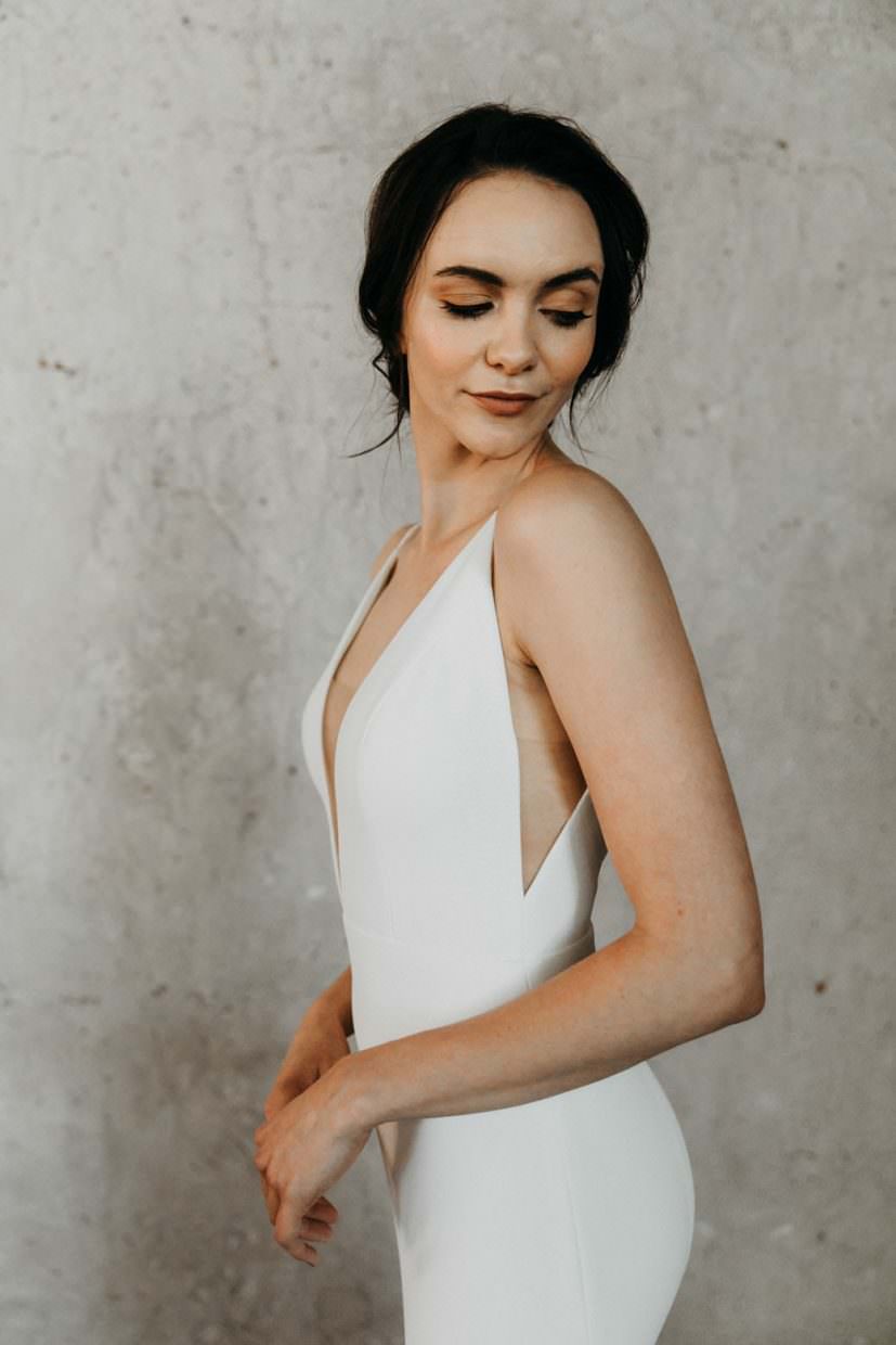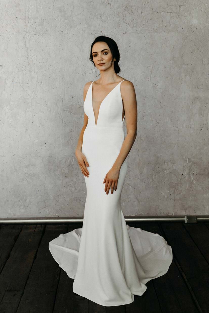 Fitted silhouette stretch crepe gown with a center front mesh v to the waist, v-back and delicate thin straps.