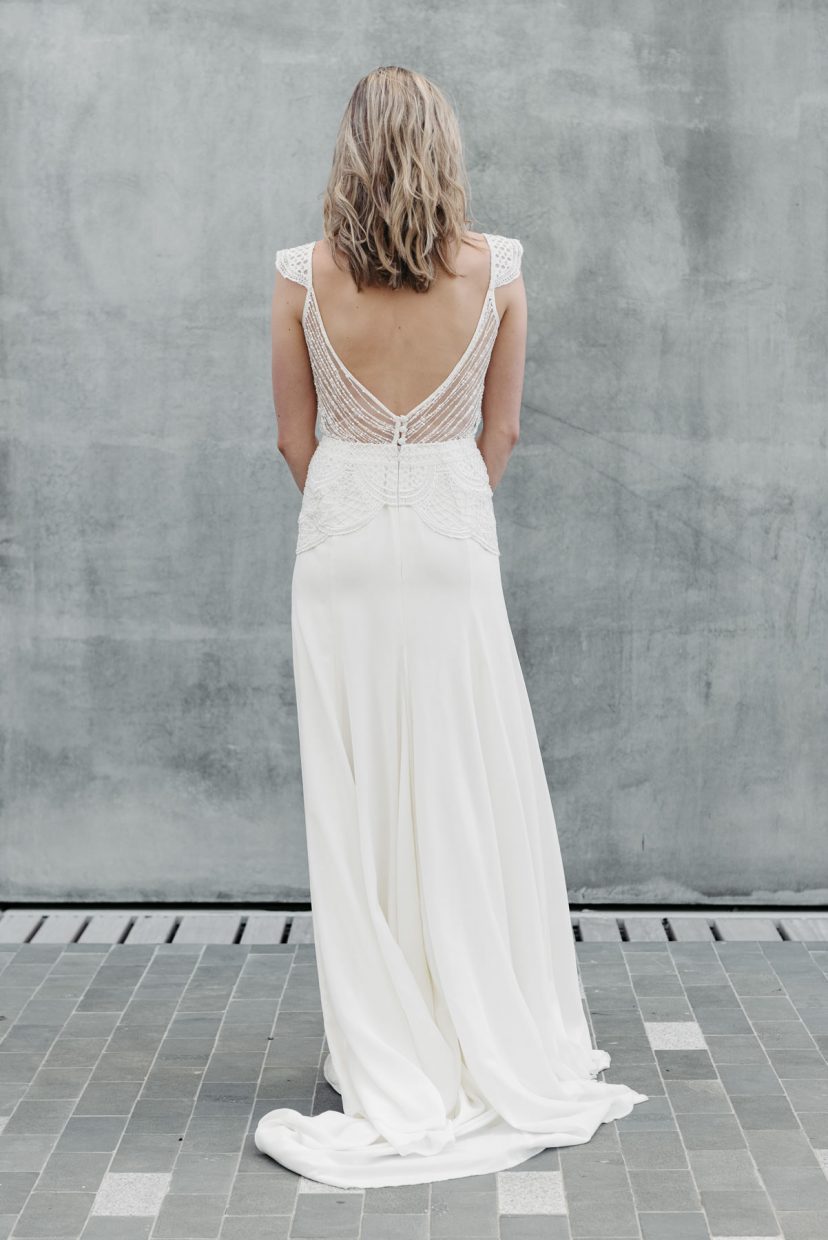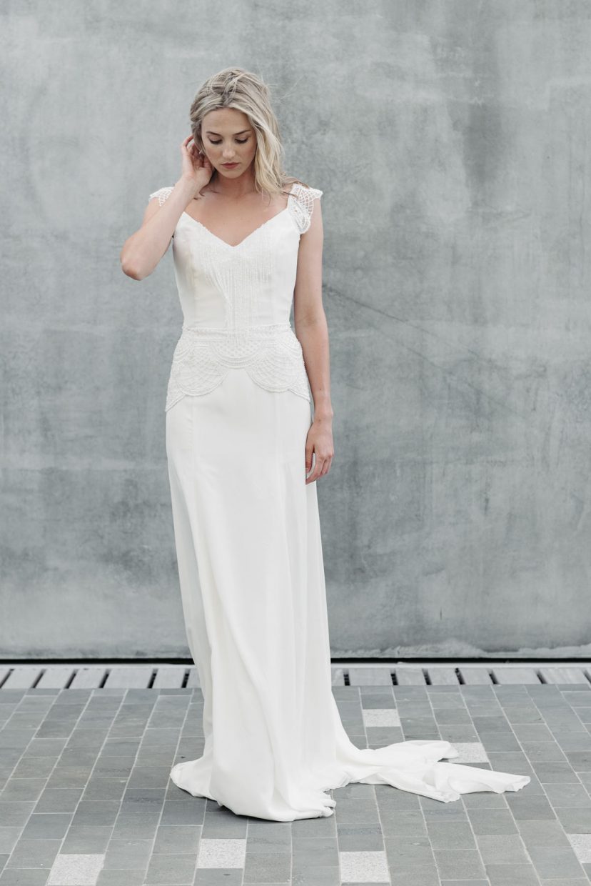 An Ivory silk crepe de Chine gown with hand-sewn beaded lace in a geometric scallop design. Sequin fringing frames the front neckline and back, lined by nude transparent tulle. A medium length train extends out from the full draped skirt.