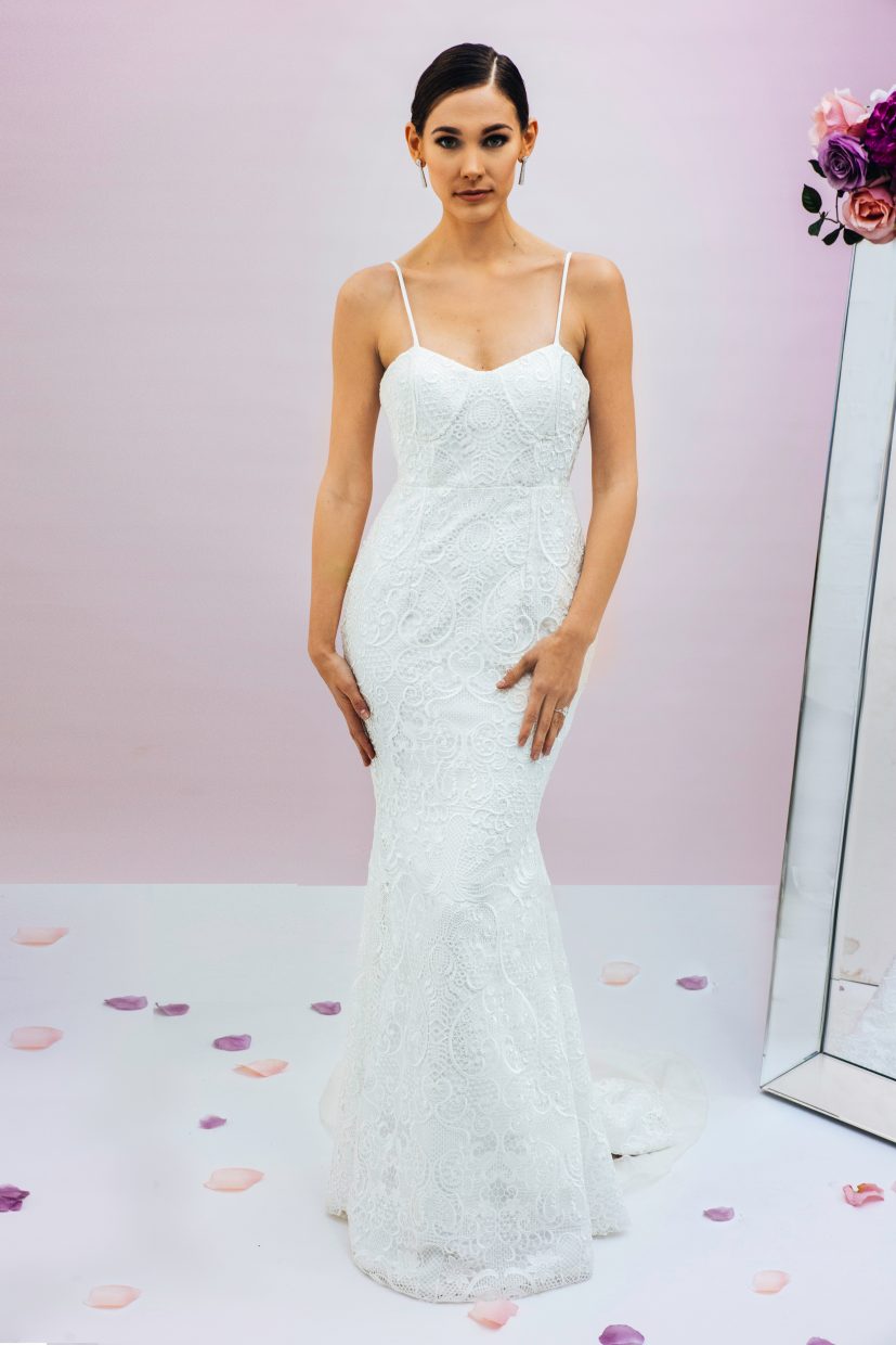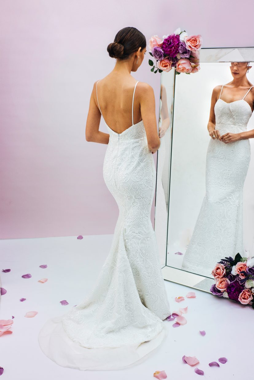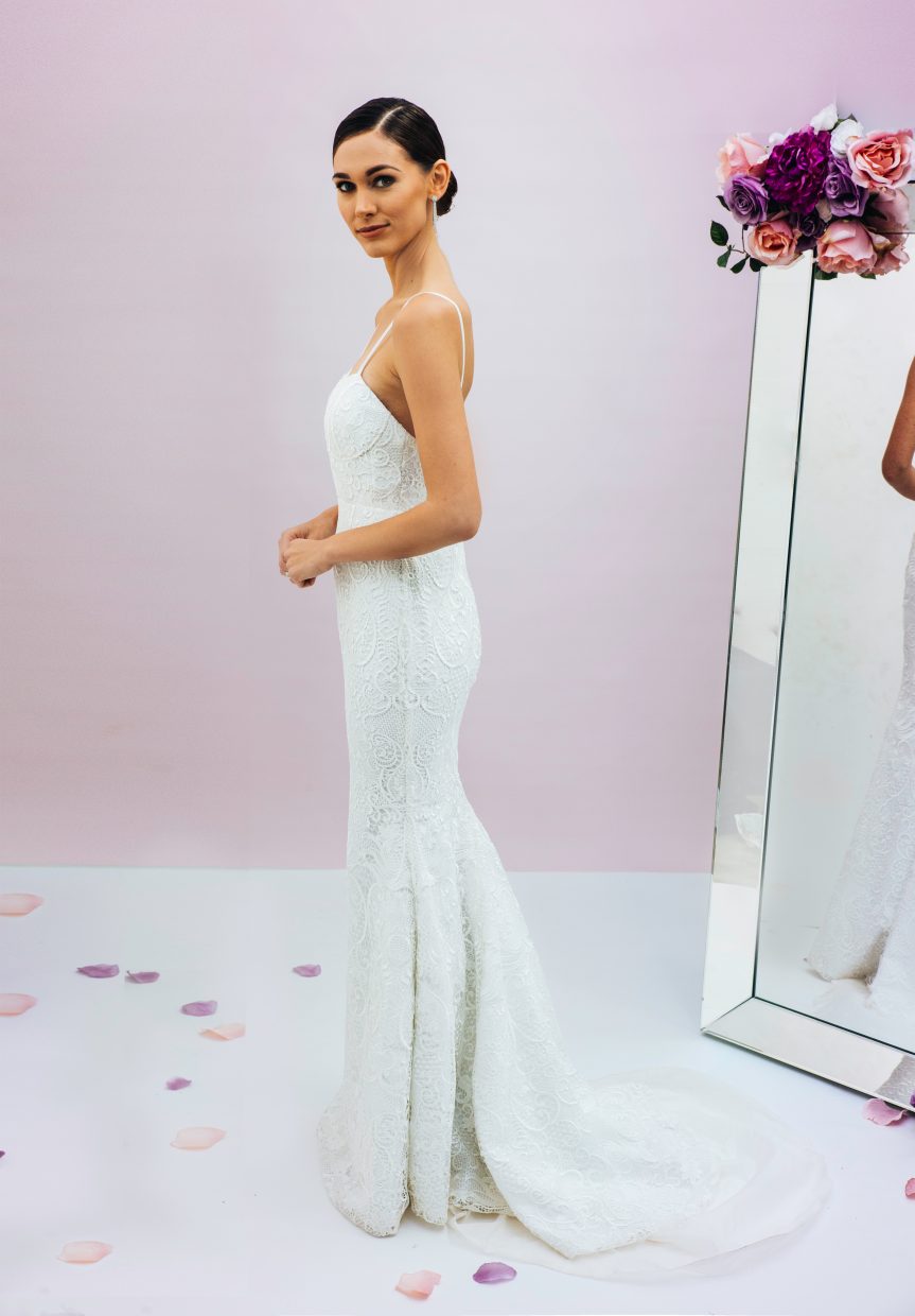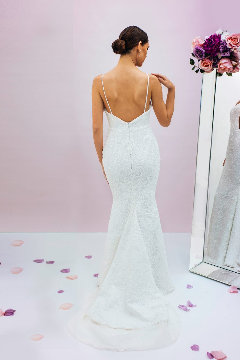 A wedding dress for the modern Bride. Thin straps into contoured bustier. Full embroidered French lace in the front and back with a subtle organza layer under the train. A slightly low back with a fitted silhouette to showcase your figure.