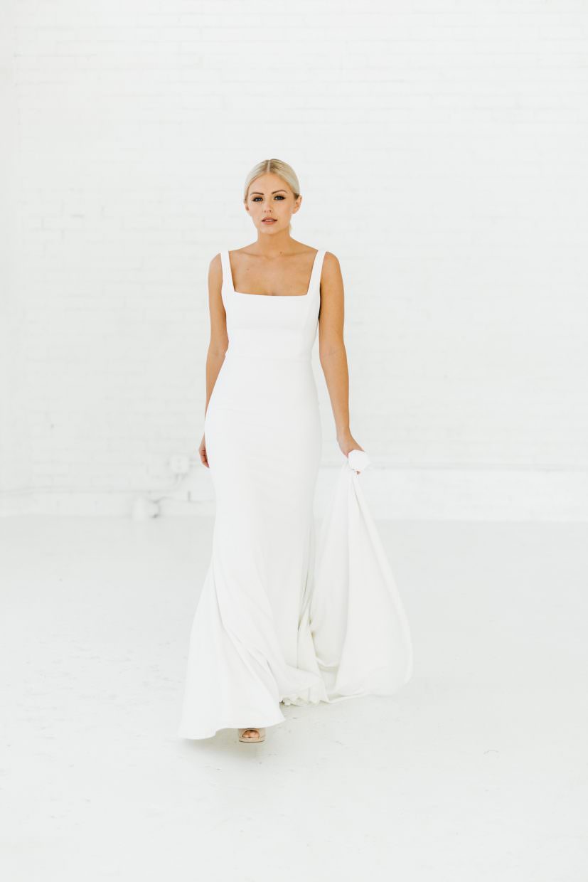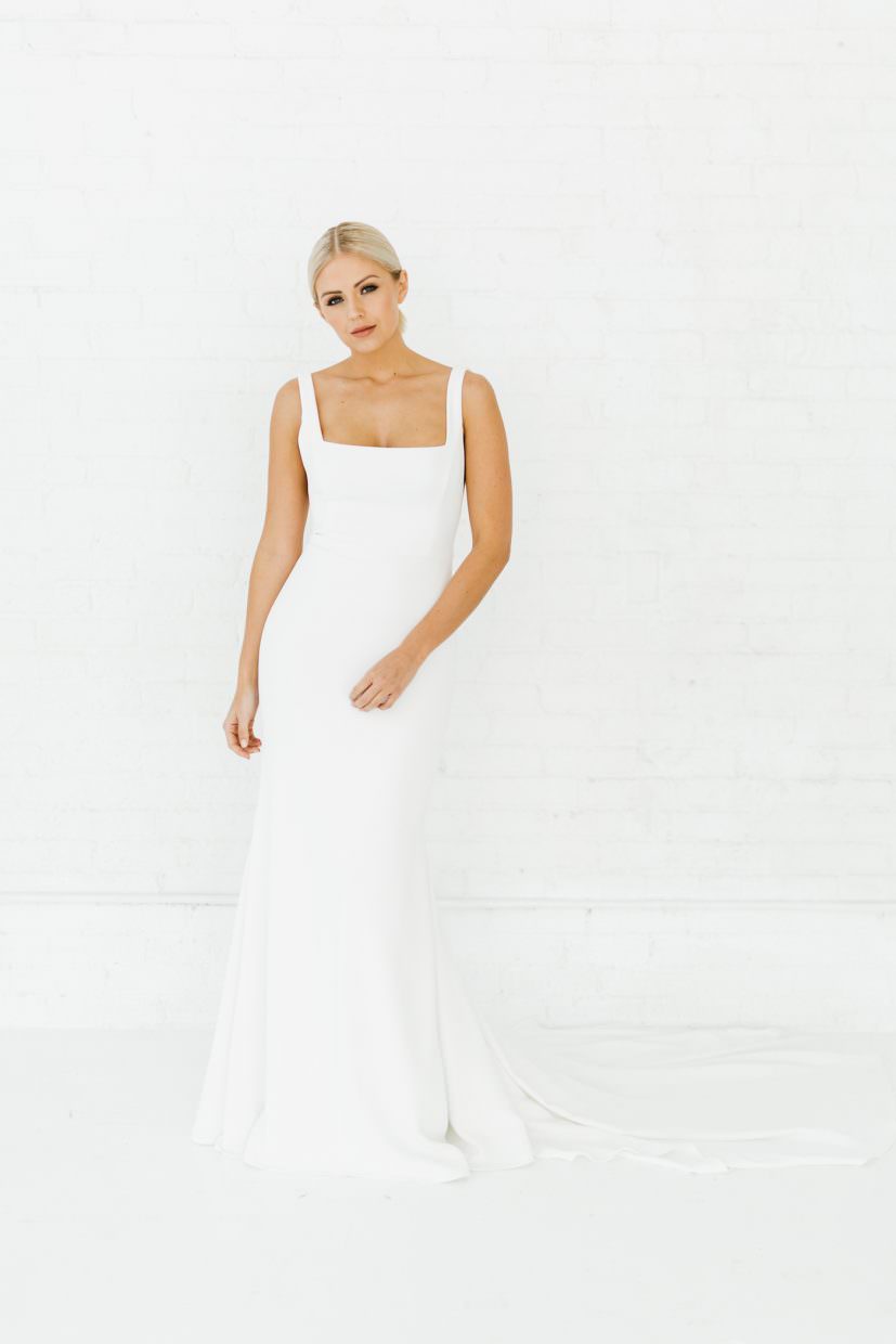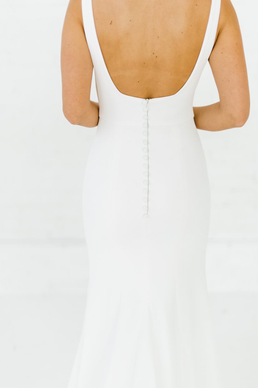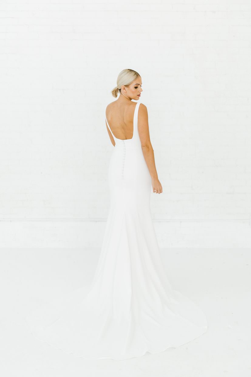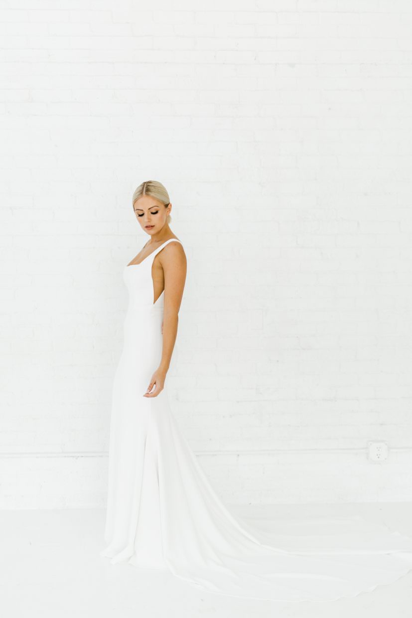 Stretch crepe gown with classic U-neckline and backline. Side features nude mesh v cutouts for a peek of skin without losing any support. Fitted silhouette with long dramatic train. Also available with an A-line skirt.