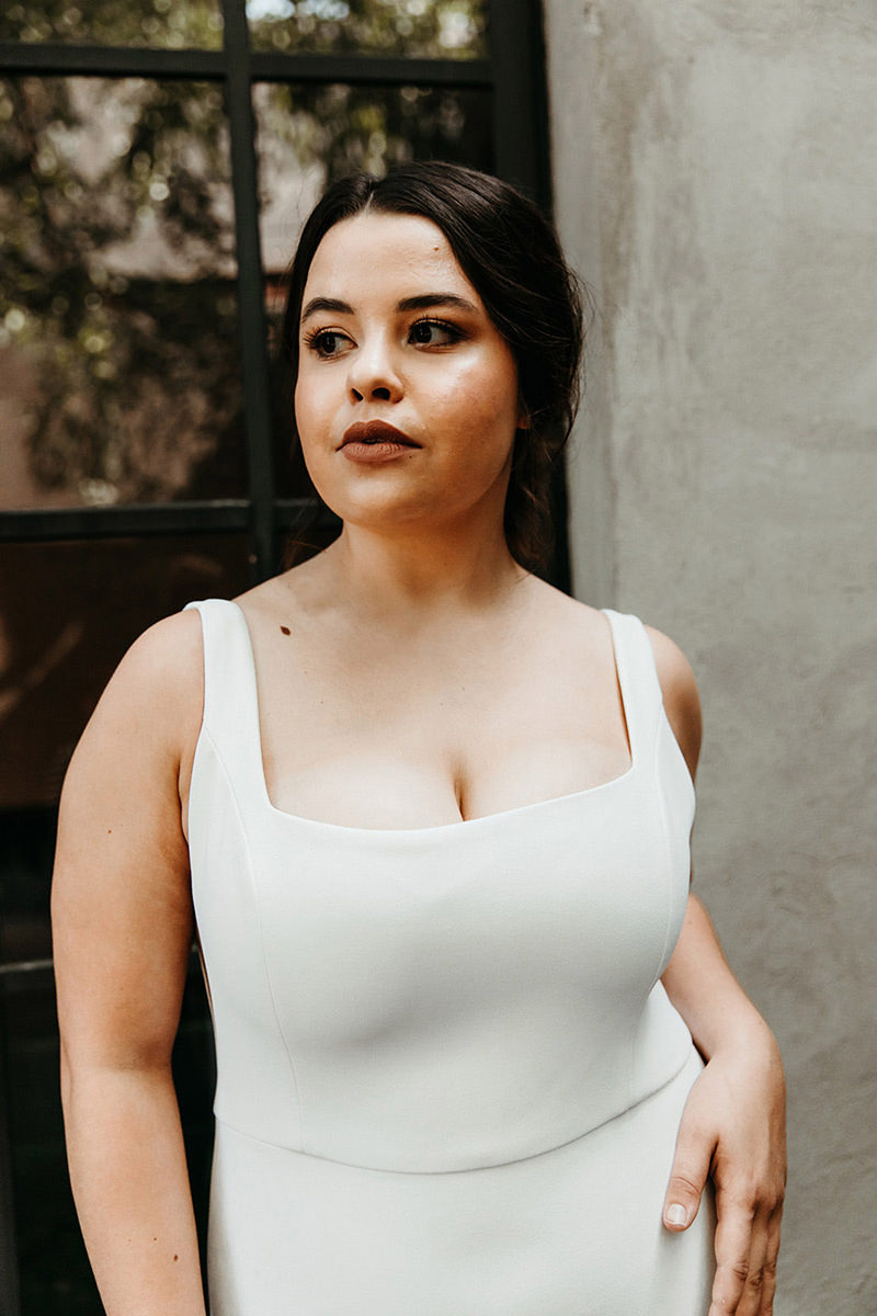 Stretch crepe gown with classic U-neckline and backline. Side features nude mesh v cutouts for a peek of skin without losing any support. Fitted silhouette with long dramatic train. Also available with an A-line skirt.