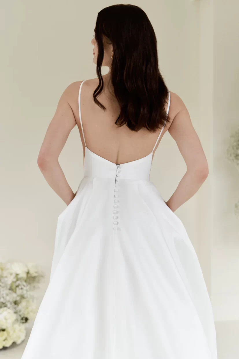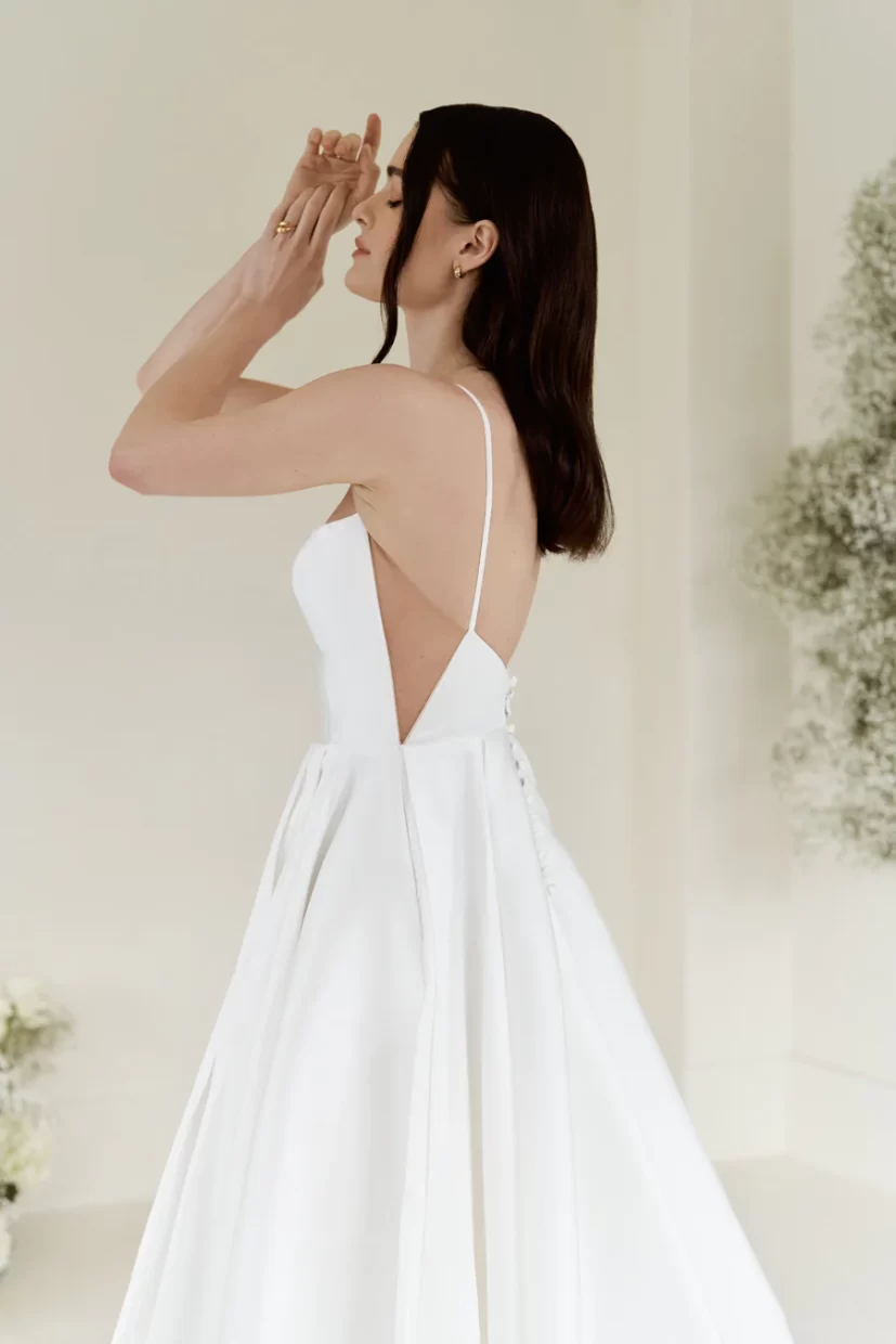 Truvelle Sylvia is the new collection’s minimalist. The straight neckline and thin straps lead into an angular side cutout which nips in at the waist. The skirt, pleated and complete with pockets, brings volume and movement in crisp mikado fabric.