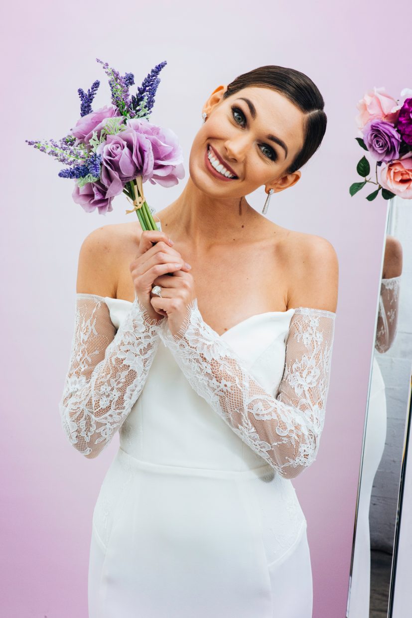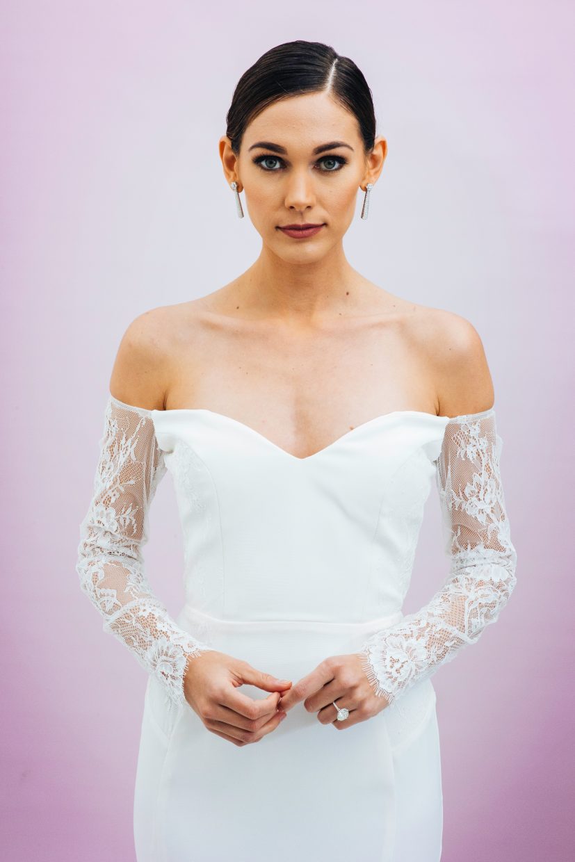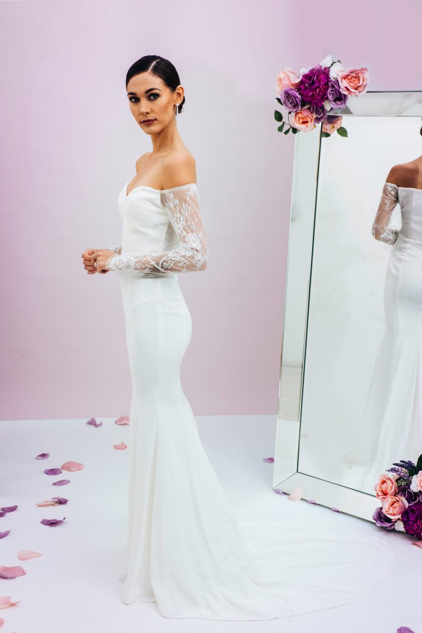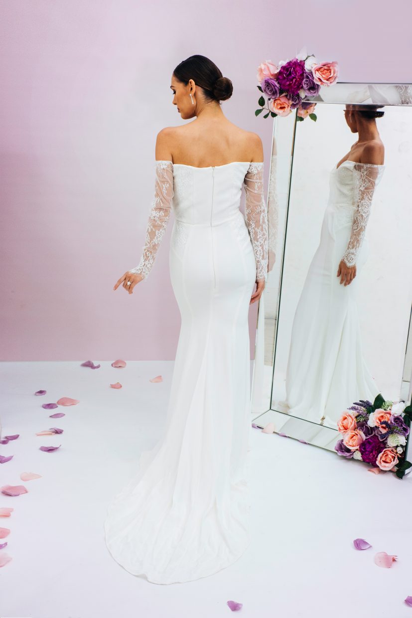 For the modern bride, an elegant off the shoulder gown with lace sleeves with a scallop edging on the wrist. Lace panels on the side of the bodice and peplum on the top of the skirt. Made with silk crepe de chine and French lace. All of our gowns are made with built in bra cups & are fully boned. Includes a satin detachable waistband for that perfect touch.